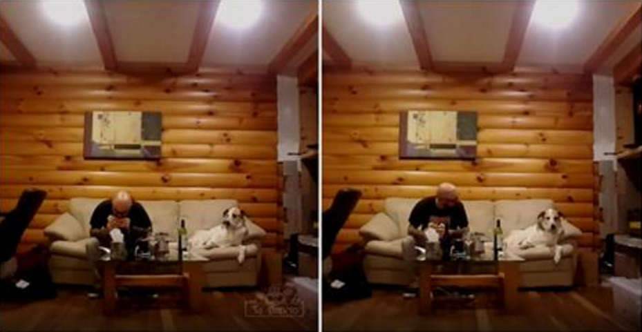 Quando o homem não está a ver, o animal olha com uma vontade tremenda de também dar umas trincas, mas quando o sujeito olha para o seu fiel amigo, o cão disfarça como se não tivesse a ver o que o dono está a fazer.